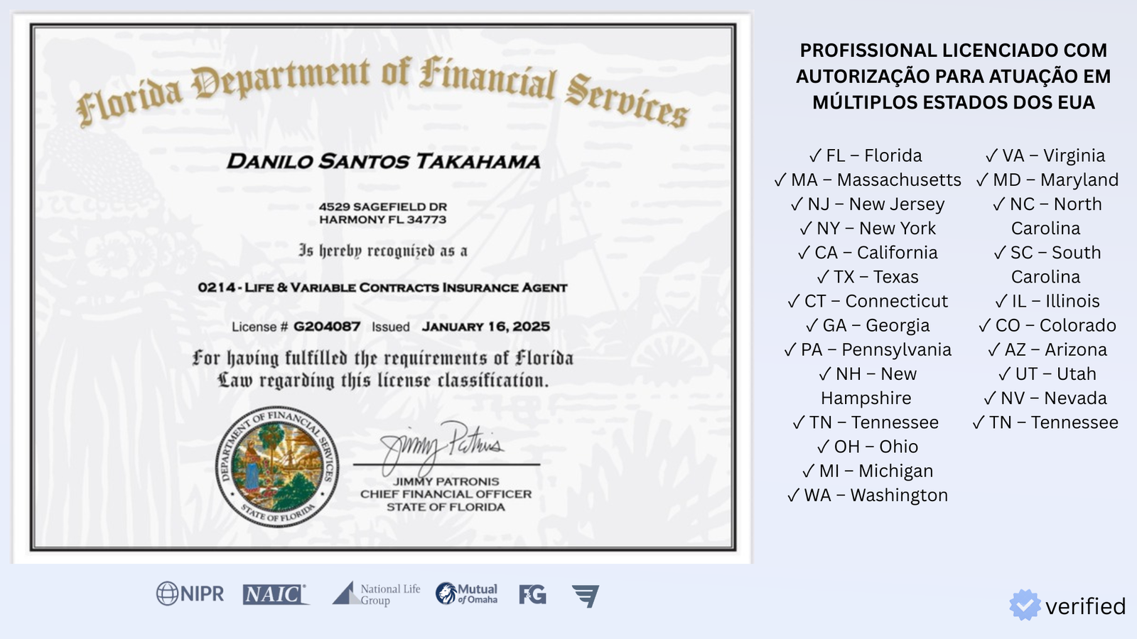 Verifique a Licença no Estado:https://nipr.com/licensing-center/look-up-a-national-producer-number